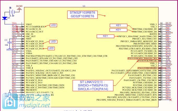 由此可见:使用SW模式PA15,PB3,PB4,都自由了就可以做普通IO口了,只用了stm32的PA13和PA14两个口!