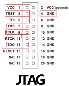 TDI–数据输入,所有写入寄存器的数据都是通过TDI接口串行输入的;TMS–模式选择,Jlink输出给目标CPU的时钟信号;TCK–时钟信号,所有数据的输入输出都是以该时钟信号为基准的;TDO–数据输出,所有从寄存器读出的数据都是通过TDO接口串行输出的;以上这四个引脚都是协议里强制要求的,而且协议建议在设计电路时要选用上拉电阻。JTAG接口有多种形式,常用的20引脚、14引脚和10引脚。