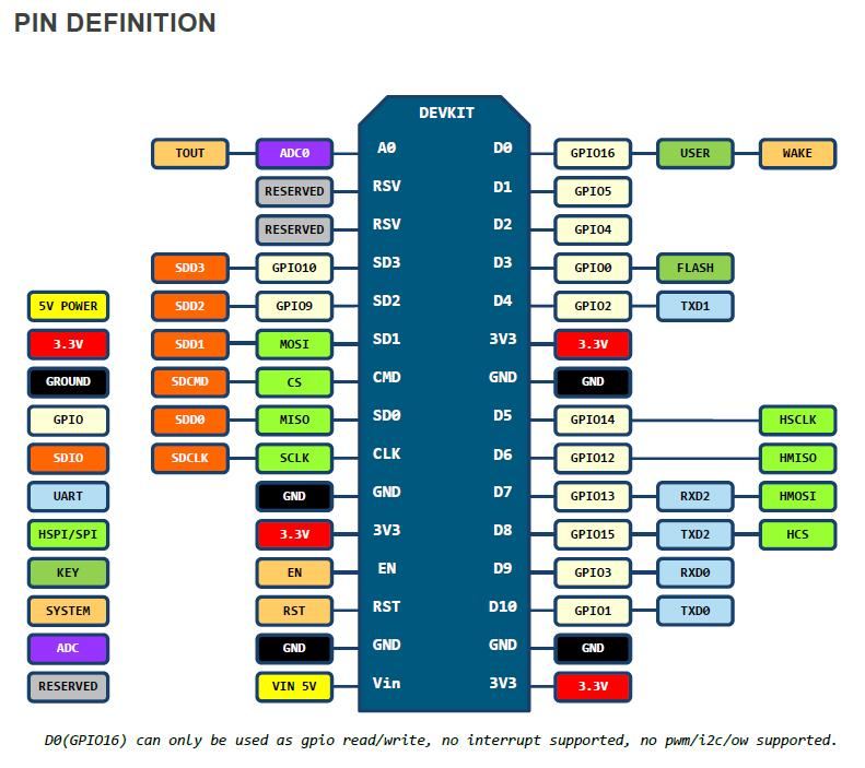 | 4 | GPIO16 | WAKE | 是 不推荐使用 | 常与RST短接,可实现定时唤醒; 开机需高电平否则启动失败; 作为输入时无中断功能; 作为输出时无I2C、PWM功能; |