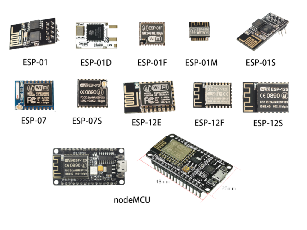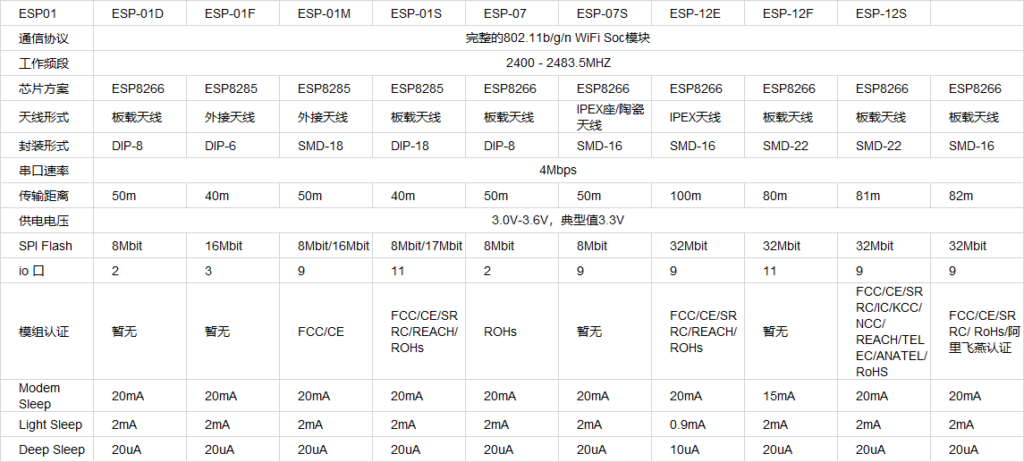 另外除了ESP8266-12F外,还有ESP-12E、ESP-12S、ESP-01、ESP-01S等等非常众多的型号,它们的区别也仅仅就是模组引出的引脚数量不同,内置Flash芯片的大小不同